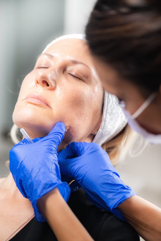 Le médecin sélectionne l’actif le plus pertinent (AHA, BHA, TCA ou rétinol) selon l’indication et le phototype, afin de lisser la surface cutanée et relancer le renouvellement cellulaire.